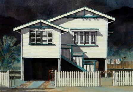 This is an old house on Severin Street, Cairns which, in 2017, still exists with some modifications of the stairs. Clothes were on the prop clothesline in the yard when a heavy tropical storm was brewing. The contrast between the white house and the dark sky backdrop was quite startling.